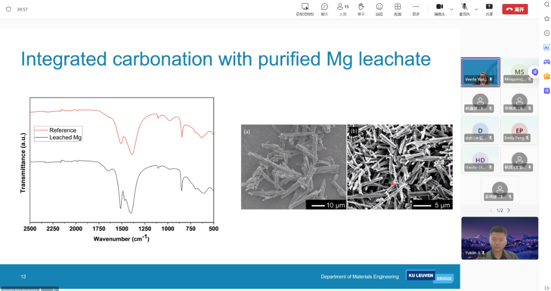 Veerle教授团队的研究集中于橄榄岩尾矿的浸出、提纯,以及其通过镁碳酸化在CO2矿化封存中的应用。所作报告题目是“利用橄榄岩尾矿进行碳吸收和矿化”,其开发了一种有效的浸出与纯化方法,通过盐酸浸出实现82%的镁提取,并利用氢氧化铵提纯工艺成功去除铁和铝杂质。使用纯化后的浸出液在室温下进行碳酸化实验,生成三水碳酸镁晶体。研究还发现,生物聚合物可调控晶体形貌,果胶可略微减小针状晶体长度,而黄原胶则将其转变为短柱状结构。该成果展示了将采矿废料转化为有价值产品并实现二氧化碳矿化封存的可行路径。