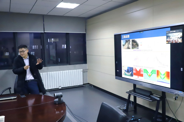 李亭副主任代表实验室致辞,他对各位青年学者来室交流表示热烈欢迎和衷心感谢,并简要介绍了实验室建设发展历程、研究队伍建设情况、人才引进政策等。蔚立元副主任介绍了实验室学科发展历史、相关科研条件等,并诚挚地邀请海内外青年才俊加入实验室。参加活动的各位青年学者结合自己的科研成果依次做了学术汇报。挪威岩土所柳淏元博士介绍了基于SANISAND-MS模型的水平循环荷载下近海单桩基础的有限元分析研究成果,沙特阿卜杜拉国王科技大学宋超博士汇报了关于高效波场重建反演与基于深度学习的正反演方法研究的最新成果,沙特阿卜杜拉国王科技大学杨亚帆博士分享了他围绕温度和环境压力对蒙脱石膨胀压力的影响及机理的分子动力学研究的总体情况,美国密歇根理工大学曹海涛博士介绍了对含流体裂缝介质中一种界面波传播特征的实验研究》,中国石油大学方金伟博士做了基于深度学习的地震数据低频预测及全波形反演学术的交流报告,香港大学郭天阳博士介绍了基于声发射和显微观察的花岗岩断裂机制研究进展,比利时根特大学史金权分享了基于初始组构-颗粒特性及级配对钙质砂力学性能的影响的研究成果,日本冈山大学三朝地球深部研究所孙伟做了关于氢氘在地幔主要矿物中的扩散速率的汇报,大连理工大学李迎春博士介绍了在岩石节理可调动剪切强度理论研究中的相关成果,大连理工大学胡李华博士分享了对应变型岩爆结构力学模型及其强度准则相关研究工作。参加沙龙活动的师生围绕汇报交流的研究成果和深地科学前沿热点问题进行了充分的讨论,会场气氛活跃、交流热烈。